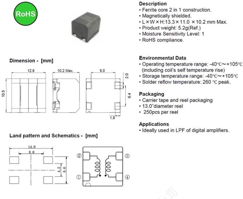 KRODOSEN 10.5x12.8mm 10UH 6.2A High Current Car D-Class Digital Power Amplifier Share Mode Inductance Power Filter KFI1310100MC